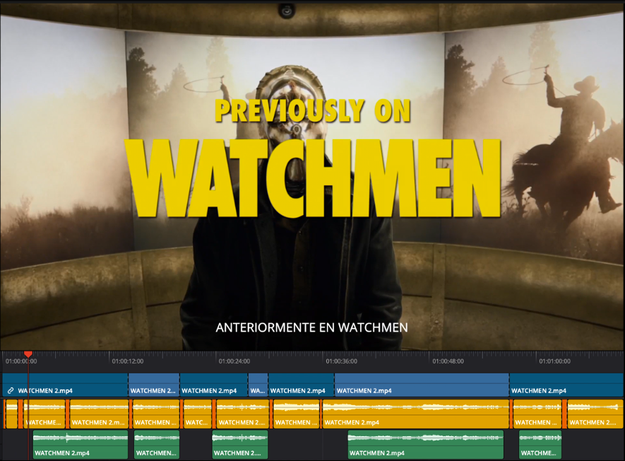 En el siguiente esquema se puede observar que cada escena del track del vídeo está representado en un color, al igual que cada voz esta representada a su vez de un color y en tracks de audio distintos: la voz del alemán en naranja, la voz del soldado en amarillo, la voz del niño en verde y la voz del anciano en azul.